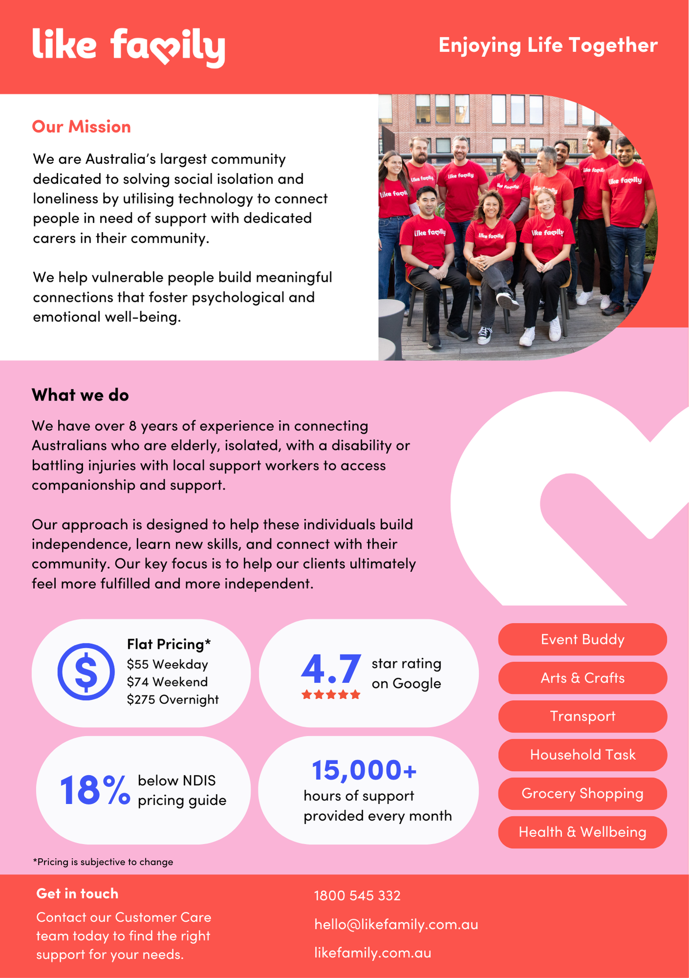 Like Family is on a mission to reduce social isolation and loneliness. We help Australians who are ageing, ill, injured or living with a disability to connect with social support in their local area.